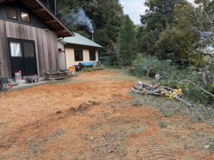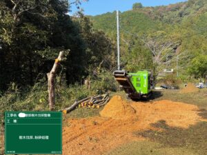 此方の現場も伐採した樹木を現地で粉砕処理を致しました。