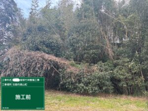 此方の現場はタケノコの採取にお施主様自らで伐採整備をされております竹林で野積された竹を現地で